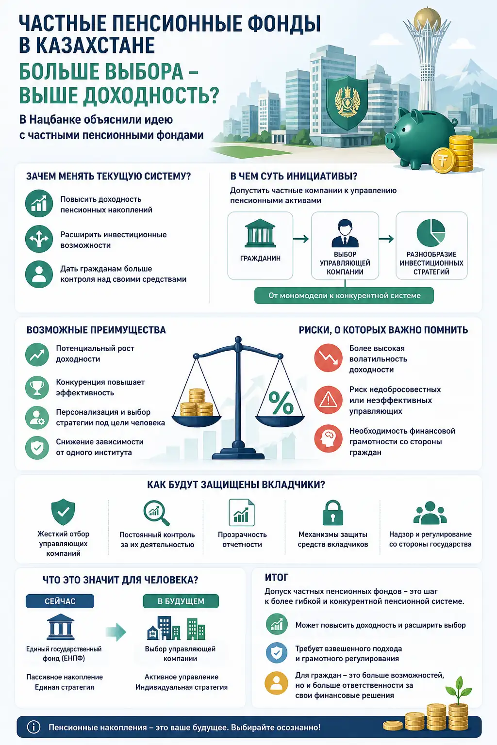 Если инициатива будет реализована, у казахстанцев появится выбор — оставить средства в текущей системе или передать их в управление частной компании.