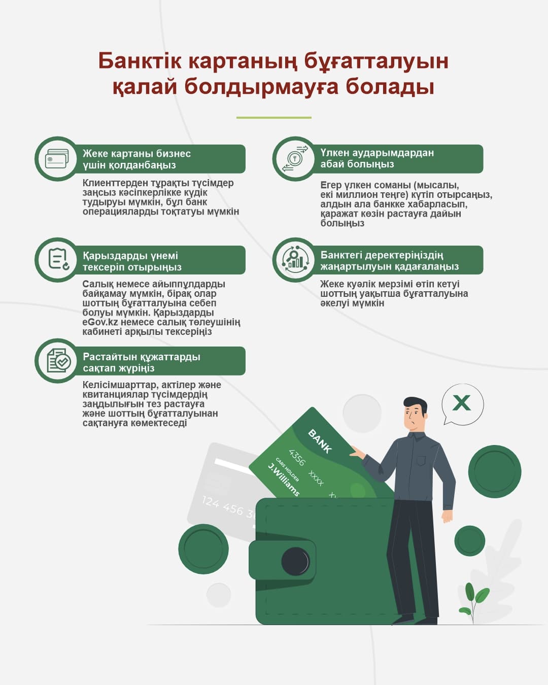 Карта бұғатталған болса, дереу банкпен байланысып, операцияны сіз жасағаныңызды растауыңыз қажет. Мұндай жағдайлардың алдын алу үшін банкке жоспарланған ірі немесе стандартты емес транзакциялар жөнінде алдын ала хабарлап қойыңыз.