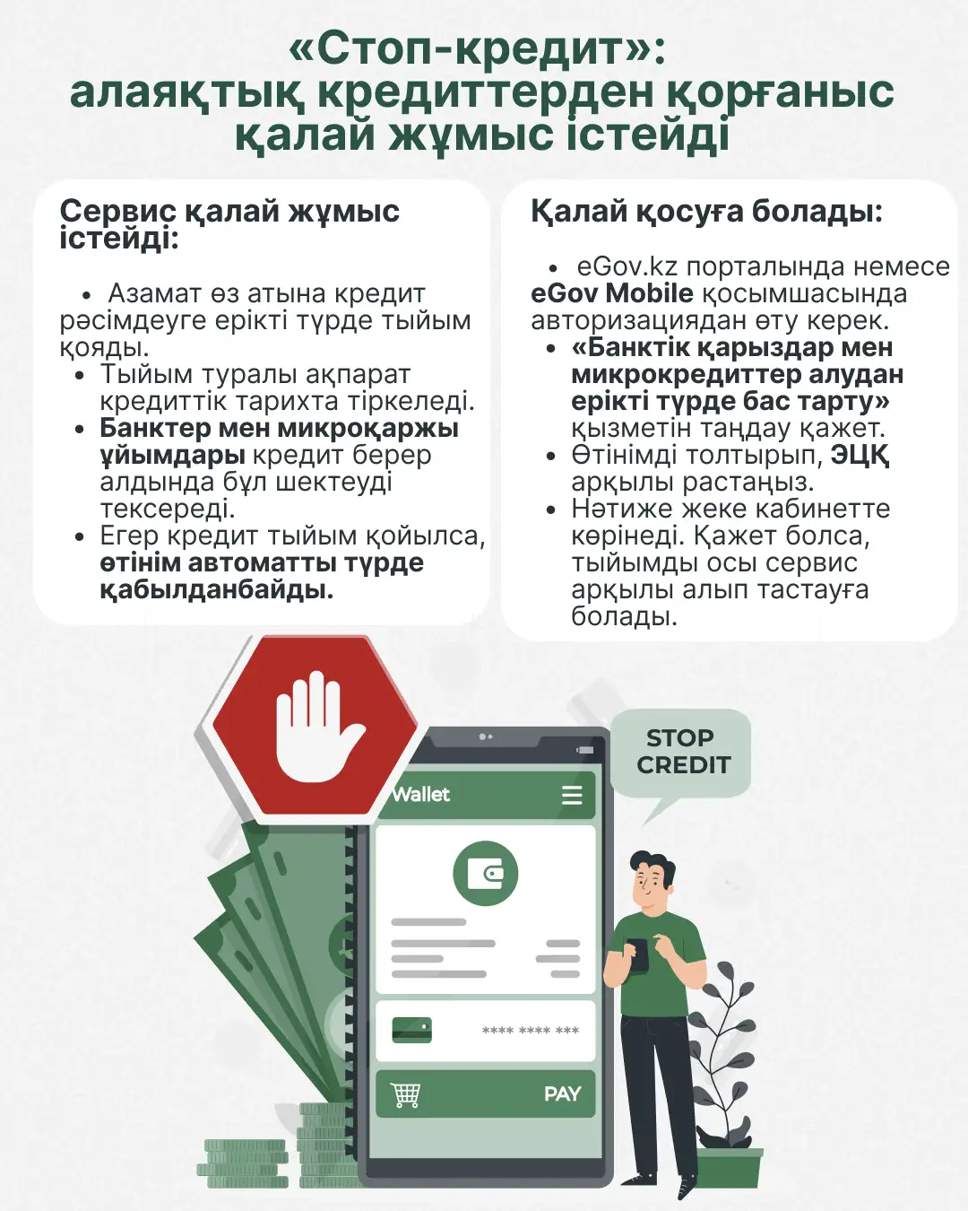 «Стоп-кредит» – бұл банктік қарыздар мен микрокредиттер алудан ерікті түрде бас тартудың мемлекеттік қызметі. Ол азаматқа өз атына жаңа кредиттер беруге өз бетінше тыйым салуға мүмкіндік береді. Сервис eGov.kz порталыеда және eGov Mobile қосымшасында қолжетімді. Шектеу мерзімсіз әрекет етеді және оны тек деректер иесінің өзі алып тастайды.