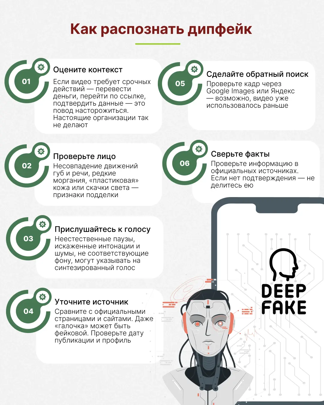 Для создания дипфейка мошенникам достаточно открытой информации: видео и аудиозаписей из социальных сетей, мессенджеров или публичных выступлений. В результате человек может услышать знакомый голос близкого, увидеть лицо руководителя или «сотрудника банка» и, не подозревая подмены, выполнить требования мошенников.