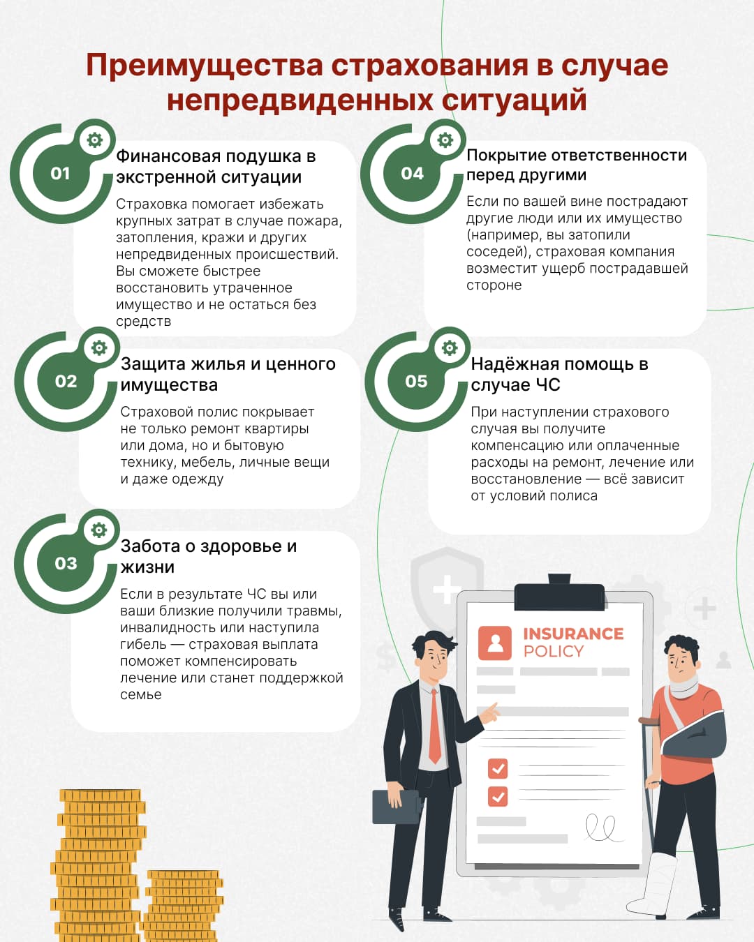 Страховой полис — это ваша финансовая подушка безопасности. Он не отменяет саму проблему, но помогает восстановиться после неё с меньшими потерями. Когда вы страхуете имущество, здоровье или жизнь, вы, по сути, договариваетесь со страховой компанией: если произойдёт несчастье, вы получите компенсацию, которая поможет пережить трудный период.
